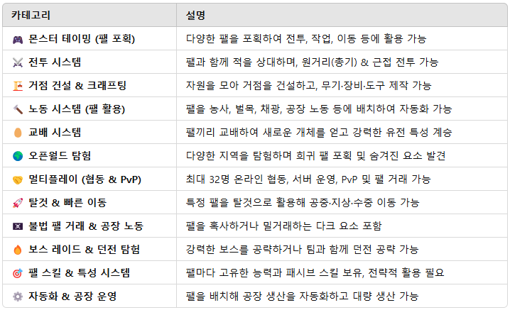 팰월드는 서바이벌, 전투, 크래프팅, 자동화, 탐험, 멀티플레이 등 다양한 콘텐츠를 포함하고 있어, 싱글 플레이부터 친구들과 함께하는 협동 플레이까지 여러 방식으로 즐길 수 있는 게임입니다!