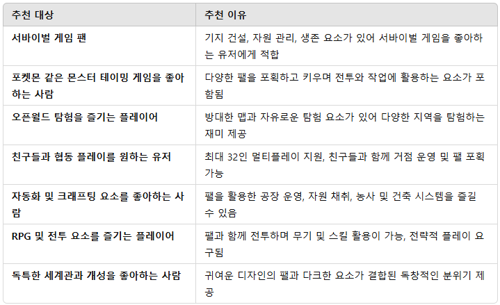팰월드는 서바이벌, 몬스터 테이밍, 오픈월드, 협동 플레이 등 다양한 요소가 결합된 게임으로, 위 추천 대상에 해당하는 유저라면 매우 재미있게 즐길 수 있습니다!