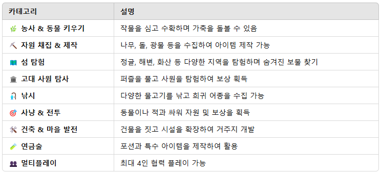 📌 TIP: 초반에는 낚시와 농사를 병행하면 안정적인 식량 공급 가능, 탐험을 통해 새로운 지역을 발견하고 희귀 자원을 확보
