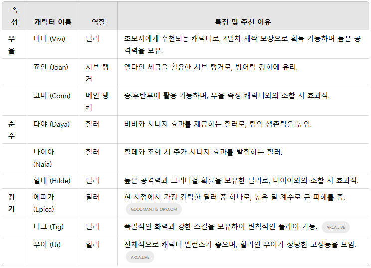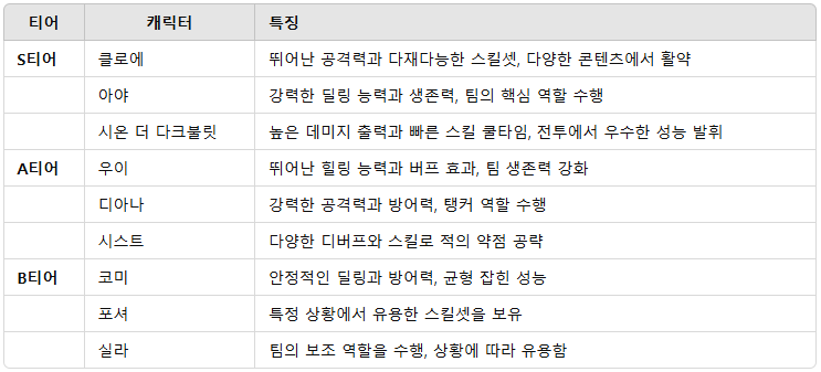 각 캐릭터는 전투에서 수행하는 역할이 다르며, 이를 조합하여 균형 잡힌 팀을 구성하는 것이 중요합니다.