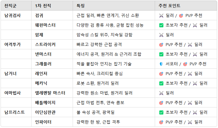 현재 남귀검사, 여격투가, 남거너, 여마법사, 남프리스트 등 다양한 전직군이 존재하며, 지속적인 업데이트를 통해 신규 캐릭터가 추가됩니다. 직업별로 개성 있는 플레이 스타일과 강력한 스킬을 보유하고 있어 다양한 전투 스타일을 경험할 수 있습니다.