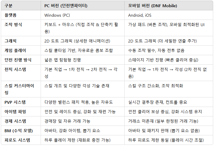 3. 던전앤파이터 모바일 vs PC 버전 차이점